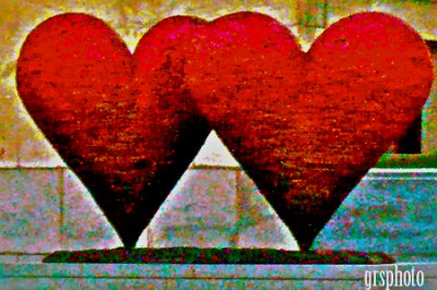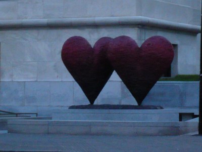 I have been making a lot of my own cards lately.  This past weekend I had the opportunity to make an Anniversary card for my cousin’s 50th. There was a particular photo I had in mind.  I had taken it a couple of summers ago in while we were on a family vacation in Montreal.  We were walking by The Museum of Fine Arts http://www.mbam.qc.ca/en/index.html and I snapped a quick picture of the sculpture by Jim Dine, Twin 6′ Hearts.